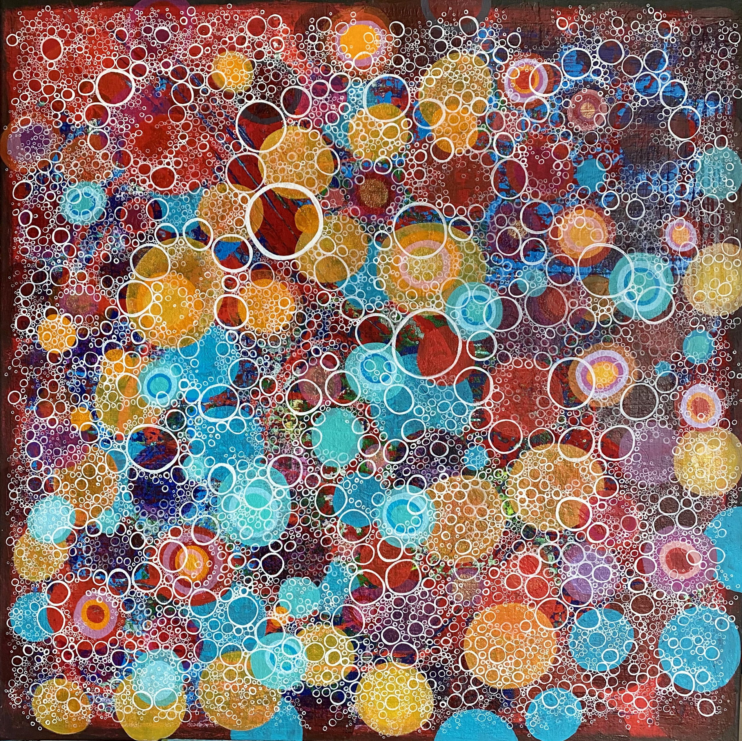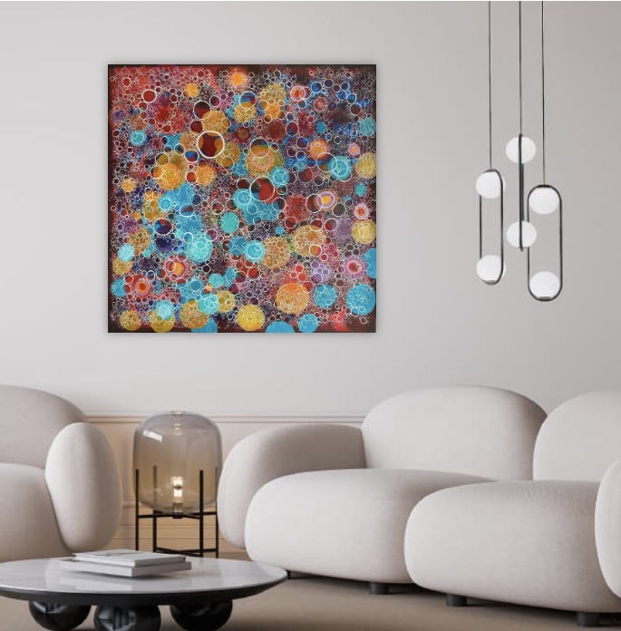 In meiner abstrakten Malerei nutze ich präzise Formen und lebendige Farben mit Acryl und Graphit, um ein dynamisches Ensemble von Emotionen zu erschaffen. Die überlagernden Kreise und lebhaften Farben bringen Energie in jeden Raum.